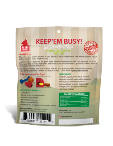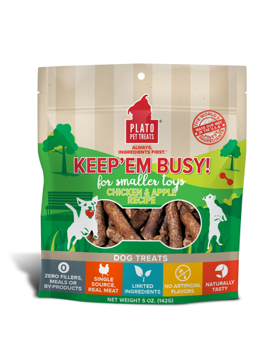 Keep’Em Busy Chicken & Apple meat sticks stuff perfectly into smaller toys to provide a tantalizing incentive and a satisfying reward.